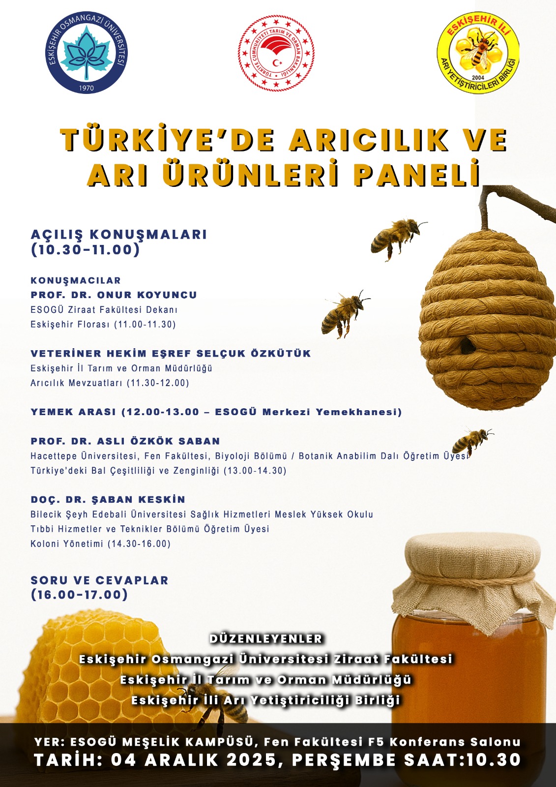 Eskişehir Osmangazi Üniversitesi Ziraat Fakültesi, Eskişehir İl Tarım ve Orman Müdürlüğü ve Eskişehir İli Arı Yetiştiriciliği Birliği ortaklığı ile düzenlenen “Türkiye’de Arıcılık ve Arı Ürünleri Paneli” 4 Aralık Perşembe günü Fen Fakültesi F5 Konferans Salonunda gerçekleştirilecektir. Tüm personellerimiz ve öğrencilerimiz davetlidir.